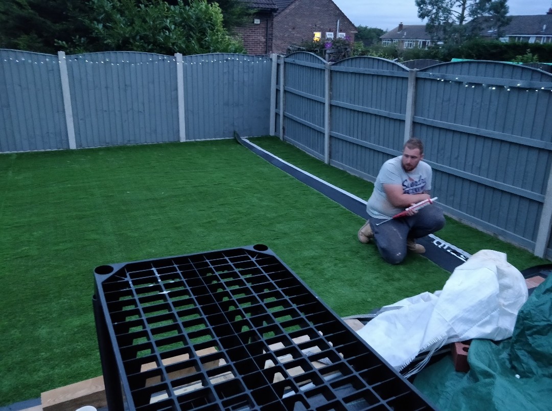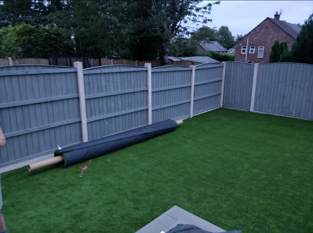 To begin with, we dug up and removed all of the old turf and plants of the garden, we then lay 2″ x 2″ timber surrounds which act as the parameter for the new artificial grass. Then came the sub bases for the area; we laid 1.5 tons of MOT and 0.75 tons of sand; this was then all levelled using a whacker plate. We then moved the roll of artificial grass in place and trimmed it to perfection. This transformation was completed over 2 days.